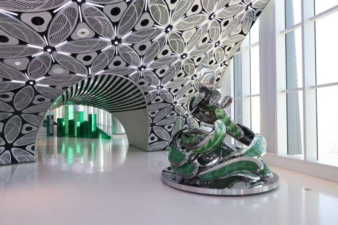 该作品由中国工艺美术大师蒋国兴先生创作,以“二十四番花信风”为灵感,融入上海市花白玉兰与中华蜜蜂的意象,既暗藏地域文化底蕴,深化游览的精神体验及情感联结,又传递人与自然和谐共生的生态主张,为空间注入温润的人文气息。作品采用不锈钢与陶瓷双材质打造,以刚柔相济的质感融入环境,螺旋上升造型搭配釉色渐变设计,既呼应了高空光影流转的视觉体验,又暗合清洁能源转型的生态理念,细节处的工艺巧思更为观光厅增添了可品味的艺术质感,实现了空间美学与核心主张的深度融合。